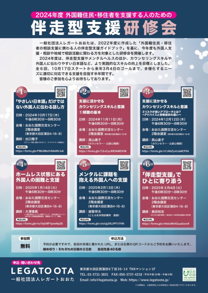 一般社団法人レガートおおたは、「外国籍住民・移住者の相談支援に携わる人の伴走型支援ガイドブック」を基に、2024年度「外国籍住民・移住者支援のための実践的研修会」を開催します。2023年度に引き続き、外国人支援や外国人相談に携わる方、地域で相談活動を行う方を対象としています。